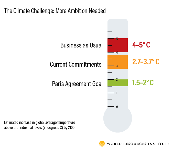 Figure 2 Global warming trajectory: No change vs. Current commitment vs. Paris goal (World Resources Institute b., 2018)